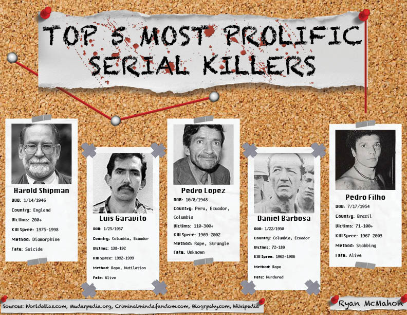 This project was created to put to the test our skills so far learned with InDesign. The topic that I chose was the suggest one which was serial killers. We had to make an infographic representing our topic and had to use characteristics that described them. I chose to use their name, country the killings took place, date of birth, number of victims, for how long they did these killings, the method they used, and their fate if they had one.
